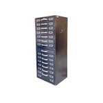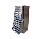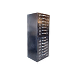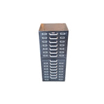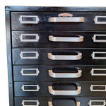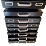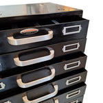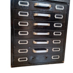 A 'Collectibles' item of precision and purpose, this cabinet stands tall with quiet authority. Its matte black metal frame, worn with time, whispers stories of workshops, archives, and creative santuaries. Each drawer, fitted with silver label holders and handles, encourages order, memory, and tactile ritual.