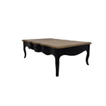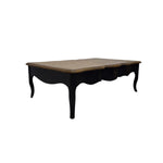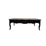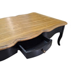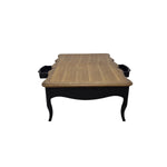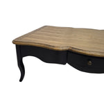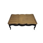 Introduce a piece of timeless elegance to your living room with this beautiful French Country Coffee Table. This design perfectly balances rustic warmth with refined curves. The spacious tabletop features a natural wood finish, highlighting a beautiful grain pattern that offers an inviting, earthy contrast. Below, the base is finished in a striking matte black, which is complemented by the graceful cabriole legs and the subtly scalloped apron. This combination creates a sophisticated, classic farmhouse aesthetic.