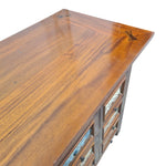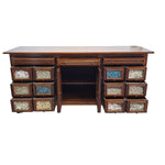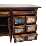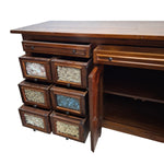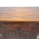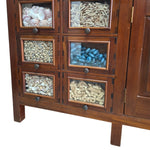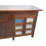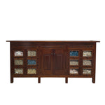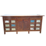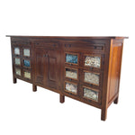 This is a truly unique sideboard that's packed with personality. The dark, rich wood gives it a classic and sturdy feel, but it's the doors that really make it special. They feature these fantastic little windowpanes filled with what looks like shells and pebbles, creating a wonderful, textural display. It's a piece that has a story and brings a touch of the ocean indoors. With multiple drawers and a large central cabinet, it offers a great mix of open and closed storage. This would be a perfect addition to a dining room or a living space, serving as both a functional piece and an eye-catching work of art.