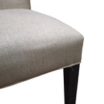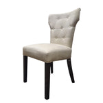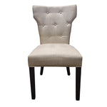 Refined yet inviting, this chair brings classic elegance into contemporary on temporary spaces.  Upholstered in a soft fabric with a gently flared back, its six-button tufting adds depth and texture, while the dark wooden legs provide a ground that speaks to enduring craftsmanship contrast