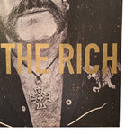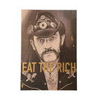 This artwork is a captivating portrait of a man with a distinct, weathered look, wearing a cool hat adorned with skull pins. His intense gaze and the "EAT THE RICH" slogan in a gold-colored overlay gives it a rebellious and unapologetic feel. It’s got a bit of a vintage rock and roll vibe, perfect for someone who isn’t afraid to make a statement with their decor. The dark tones and rough edges make it feel authentic and lived-in. This piece is perfect for a bachelor pad or a man cave.