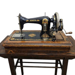 Embrace the nostalgia of a bygone era with this exquisite antique Jones hand-crank sewing machine. A stunning example of late 19th or early 20th-century engineering, the machine features a sleek black finish adorned with intricate gold-leaf scrollwork and the iconic "Jones" branding. It stands proudly upon its original wooden base, which is integrated into a custom-fitted rustic wooden table, creating a complete workstation that is as beautiful as it is historic.