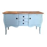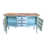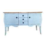 Invite a piece of timeless character into your home with this stunning vintage-style sideboard. Perfectly balancing form and function, this piece features a beautifully distressed mint green finish that evokes a relaxed, farmhouse-chic aesthetic. The natural wood top provides a warm contrast, showcasing the beautiful, aged grain perfect for displaying cherished decor, a collection of books, or serving appetizers during a gathering. The craftsmanship is evident in the subtly curved profile and elegant tapered legs. Offering superb storage, the central column features three generously sized drawers, flanked by two spacious cabinets, each secured with simple, appealing black knobs. This is more than just storage; it’s a statement of style that adds a gentle, welcoming charm to any living room, dining area, or hallway. Made from durable wood, this piece promises to be a treasured and versatile fixture in your home for years to come.