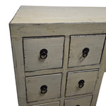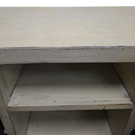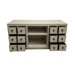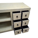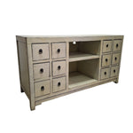 This isn't your average TV console; it's a piece with a story. With its array of small drawers and a distressed, off-white finish, it has the charm of something you might find in an old apothecary or a seaside cottage. Each little drawer has a small metal knob, giving it a playful, almost dollhouse-like feel, while providing tons of practical storage. The simple, low-slung design with open shelving in the middle makes it a perfect spot for your media players, consoles, or other electronics. This unit would look fantastic in a home with a vintage or rustic style, bringing a touch of quaint charm and character that you just don't get with brand-new furniture.