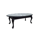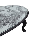 This beautifully crafted oval table features a swirling decorative top and gracefully curved black legs. Perfect as a hallway accent or beside a lounge chair, it adds charm and sophistication to any corner.