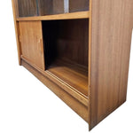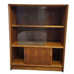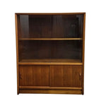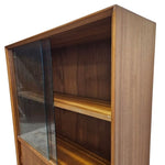 Embrace the clean lines and functional beauty of mid-century design with this versatile teak display cabinet. Crafted with a rich, honey-toned wood grain, this piece brings a sense of grounded elegance to any living space or home office. The upper section features sleek sliding glass doors that protect your favorite collectibles, glassware, or books from dust while keeping them perfectly on display.