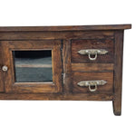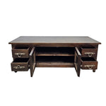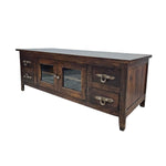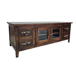 The central glass-front doors offer a refined stage for your media devices or curated decor, keeping them visible while protecting them from dust. Flanking the center are four spacious drawers adorned with ornate, vintage-style metal pulls, providing generous storage for cables, remotes, or linens