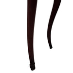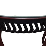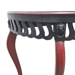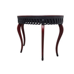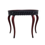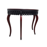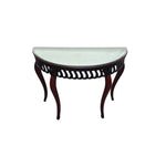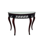 This elegant console table is a beautiful piece that brings to mind a classic French drawing-room or a grand entryway. It has a distinctly vintage feel, mixing a sense of formality with decorative flourishes. The half-moon shape is perfect for a narrow hallway, making it a functional accent that doesn't overwhelm the space. The legs are a striking rich wood, curving gracefully in a classic cabriole style, while the dark tabletop features intricate cut-out carvings along the front that give it a unique, decorative border. This table would be wonderful for displaying a collection of family photos, a small vase of fresh flowers, or a decorative lamp, adding a touch of timeless sophistication to any home.